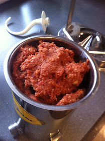 After mixing until slightly sticky, I fried a sample patty. With $45 dollars of lamb on the line, I feared too much salt or too much hot (harissa) and I fell content too quickly. The salt was perfect but (in hindsight) it lacked heat and it wasn't red enough. I really, really wanted the blazing red color. I now realize the signature of this sausage is harissa and I should've made my own, but the stuff I bought tasted good and was smokin' hot; I think I was simply too light on it.