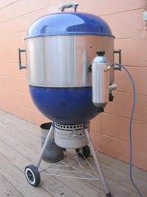 For xmas, the wife gave me a Smoke Daddy smoker offset box. A well-machined bit of aluminum and steel made to fit into a chamber with hand-tight fittings via a 7/8" dia hole. The smoke comes from wood and today I'm using Traeger smoking pellets hoping to get a longer smoking session without having to do more than sip beer and stare at it. I used plain old chips off the shelf, but they burned too quickly. The pellets I got for just under a buck a pound were just what this rig needed. One charge of 200 grams of pellets goes for 3-4 hours. The line into this thing (that blue line) is hooked to a small aquarium pump. This is necessary to keep the combustion going, the lit pellets will suffocate without a perk of air. I'll try slowing the flow of air to get a few more hours out of it.