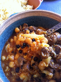I don't usually post what I ate last night, but I don't want to forget this one. I took a bunch of merguez out of the casing, sauteed it slowly to render the fat. Then I removed the meat from the pan. To the wonderfully spiced fat, I added a little more olive oil, a bunch of slivered onion and cauliflower, some stock, tomato paste and braised until the cauliflower was tender. I then added a can of chickpeas and about a cup of currants and then added the meat back in. The entire mixture was then simmered gently until dinner, about an hour. Really, really good, a keeper.
