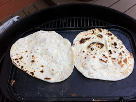 After a few youtube vids, I heated a griddle on my grill, mixed up some dough and went at it. The dough is simple: 500 grams unbleached white flour, 100 grams lard, 5 grams salt, 5 grams baking powder and 300 g water, knead and let rest 20 minutes. I took hunks of about 60-70 grams of dough, rounded them and rolled with a rolling pin to about 8-10" diameter - that's pretty thin. They are delicate, but not too difficult to handle, that is if you don't spill a PBR Tall on them. If that happens, drink some beer, squish the soggy mass together, add some flour and repeat a few steps from above.