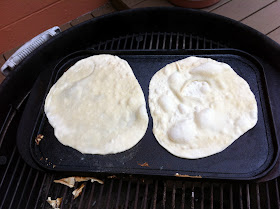 After a few youtube vids, I heated a griddle on my grill, mixed up some dough and went at it. The dough is simple: 500 grams unbleached white flour, 100 grams lard, 5 grams salt, 5 grams baking powder and 300 g water, knead and let rest 20 minutes. I took hunks of about 60-70 grams of dough, rounded them and rolled with a rolling pin to about 8-10" diameter - that's pretty thin. They are delicate, but not too difficult to handle, that is if you don't spill a PBR Tall on them. If that happens, drink some beer, squish the soggy mass together, add some flour and repeat a few steps from above.