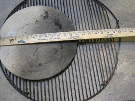 Final modification: the upper grate. Place your pizza stone on the top grate, mine is a 13" diameter. Got it at a thrift store and it's thick! I've had it for years. The ruler is there because I was too lazy to pick it up.