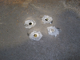| I (ab)used a philips head screw driver and hammer to make a punch on the surface. Do this on all of the holes, remove the tape and drill out the holes with a 1/4" bit. |