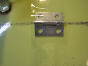 I secured the hinge with 3/16" pop rivets, use machine screws if you want, I enjoy rivets, they don't come loose. Repeat with the other hinge. The rivets are aluminum, but the hinge is Zn-coated steel. It'll rust after a run or two, but don't worry, I've had the hinges last over a year.