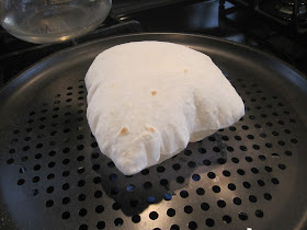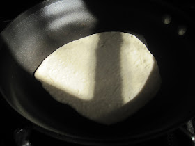 Tear off 40 g blobs of dough and round them, using scant flour to keep it from sticking, roll out as thin as you can, ca. 6" diameter. Let rest a minute. Preheat a dry pan, cast iron or any heavy bottom pan to a surface temp of about 400F (that's about medium on a big burner). Have some kind of perforated sheet pan on top of an adjacent burner.