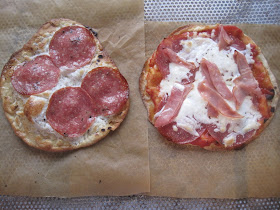Pita mania continues here at the ranch. The soft and tender pita are lying around after the flurry of recent activity. Today we took some of the leftover pita, those made from atta flour, and topped them and baked at 450F. It is a most crisp and delicate substrate for pizza. Almost as good as starting with fresh dough.