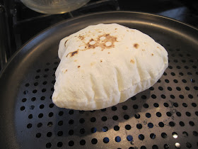 Take the piece of dough and toss it in the dry pan for 40 seconds per side and then toss it on the perforated sheet until it puffs. Flip and let it cook 10 seconds or so on the other side to get some charry marks. Wrap the pita in a towel. They'll stay nice and soft when cooled.