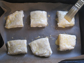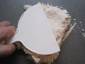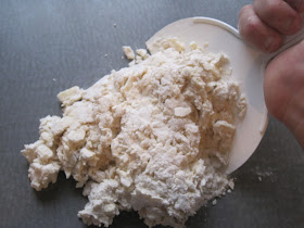Cut butter (80 g) into self-rise flour (240 g), add milk (160 g), mix together and dump shaggy mess on counter.