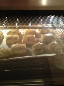 Baking ham and cheese, nutella and even marshmallow fluff filled (Scoops got the marshmallow one, ick)