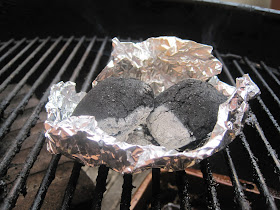 Lighting up a pile of briquettes using just a couple lit ones atop a pile of unlit fuel is a great trick for a long slow burn.  The snag?  Lighting 2-3 briquettes can be pretty maddening!  This is my trick for that.  Puddle some lighter fluid** with a couple briquettes in a cup of foil, light and let burn off.  About 5 minutes to two perfectly lit briquettes.  You are welcome!