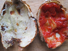 But is this just another version of stuffed potato skins? Then the horrible images of Applebees frozen & reheated potato skins came stampeding into my memory bludgeoning my hopes of a satisfying creation. But I forged on. Like many foods I think about, this involves few ingredients and process. I decided to jump in with a quickie today. Here's my first shot: