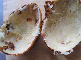 I scraped the potato out using a spoon. Tough to tell from the photo, but there is very little potato left and the crispy skins, on cooling, became supple enough to work with.