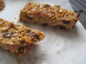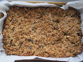 Warm up the gloppy ingredients in a sauce pan until pretty hot and add to dry ingredients. Mix. Add to parchment lined 11" x 7" pan, press lightly to fill pan, bake at 350F for 25 minutes. Let cool at least an hour in the pan. Remove from pan, cut into bars slowly with a serrated edge knife - they are still kind of soft, so go slow. Let the bars sit out on the counter - away from dogs - about a day, they'll firm up.